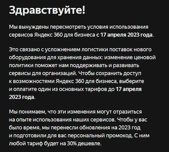 Мы вынуждены пересмотреть условия использования сервисов Яндекс 360 для бизнеса с 17 апреля 2023 года.